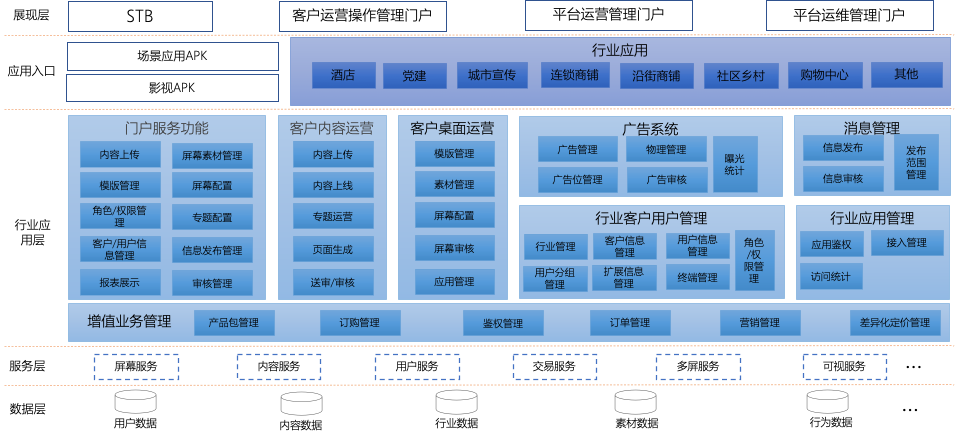 易视腾科技的行业大屏平台具体功能包括互联网电视节目、视频点播、行业客户个性化门户定制、行业特色内容或应用呈现等功能和服务,通过一整套平台服务能力实现行业定特征定制化。自办频道集成,通过全新的组网升级方案,将机顶盒全部放置在机房内,由多个机顶盒输出多路高清信号源(每个机顶盒输出一路高清信号),通过编码器和同轴电缆/网线,将信号传输至电视屏幕。灵活与行业业内系统对接,通过与酒店管理系统、医院HIS系统等对接,可以通过屏幕显示酒店用户信息和病人入住信息及入院须知等信息。