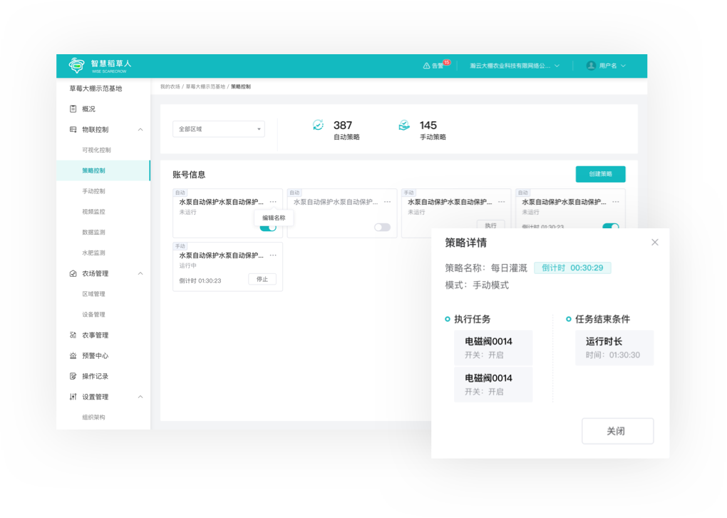 绿化灌溉瀚云智慧稻草人针对大棚种植、大田种植、畜禽养殖等多样化农业场景的监测、控制、管理需求, 专业向集成各种功能模块,满足种养殖农户在线管理需求
